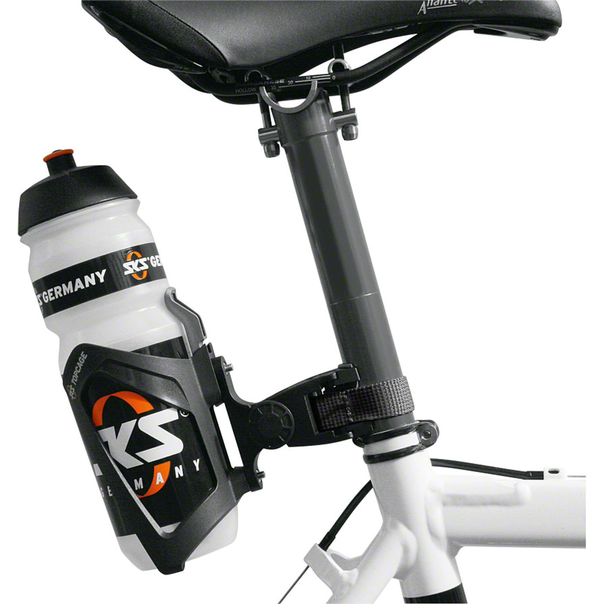 The SKS bottle holder adapter can be attached to the seat post, the stem or about anywhere with this adjustable, well-proven SKS quick-release mount system