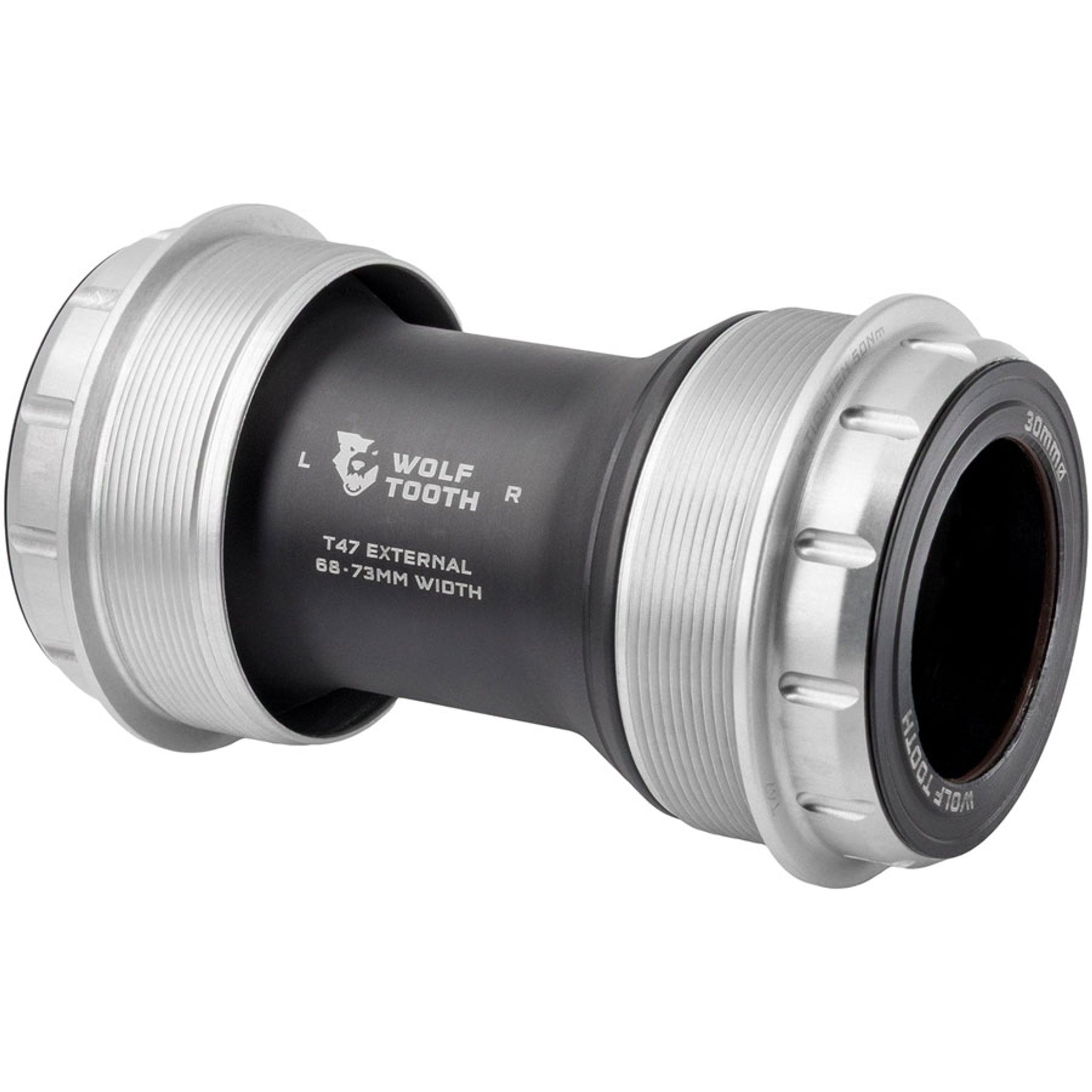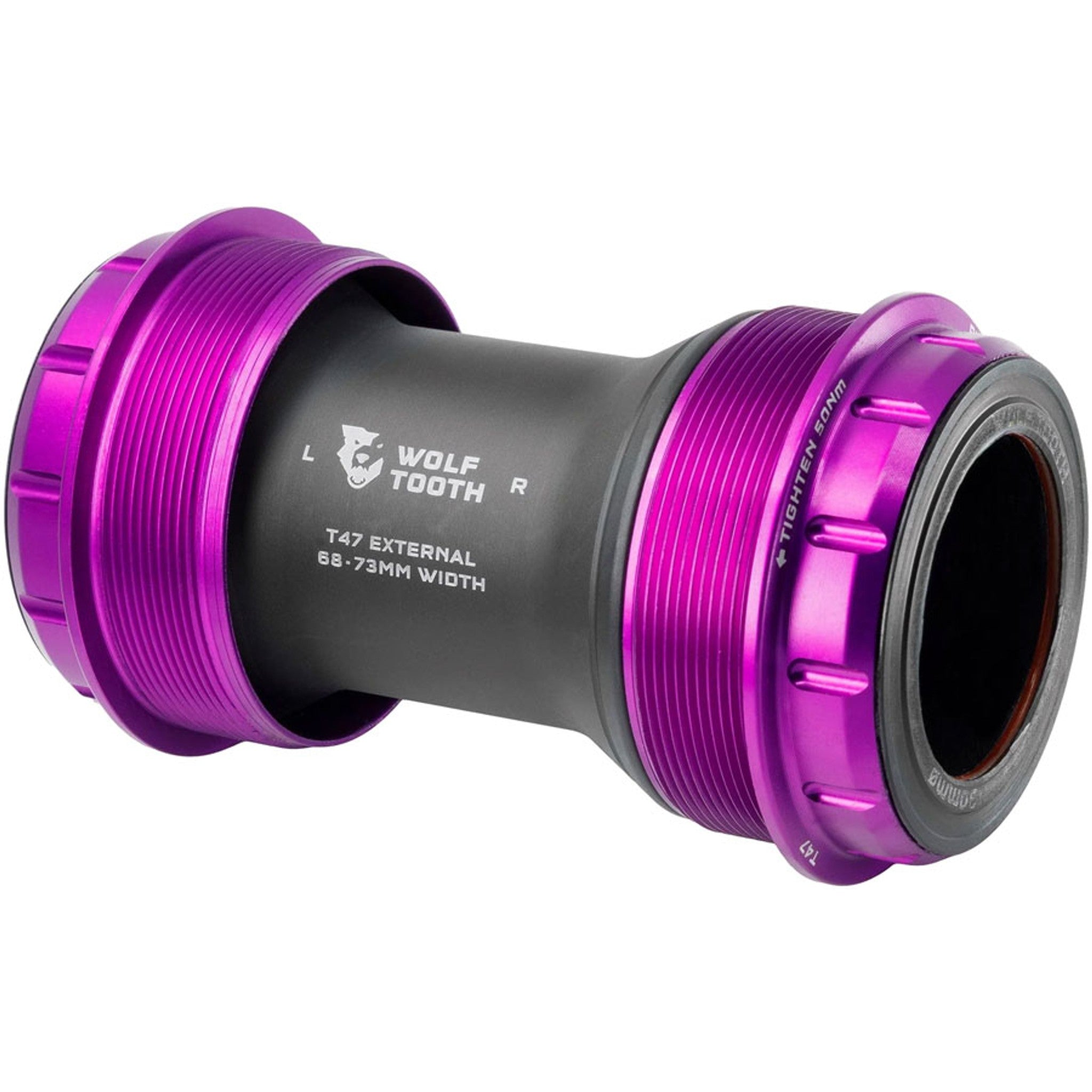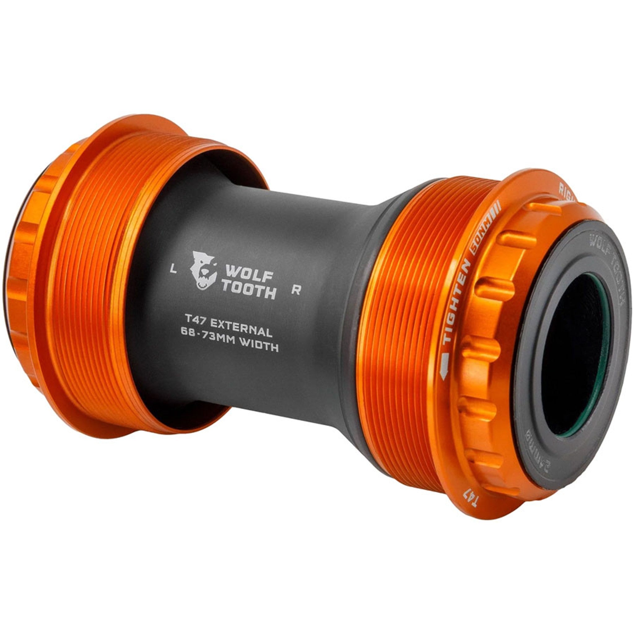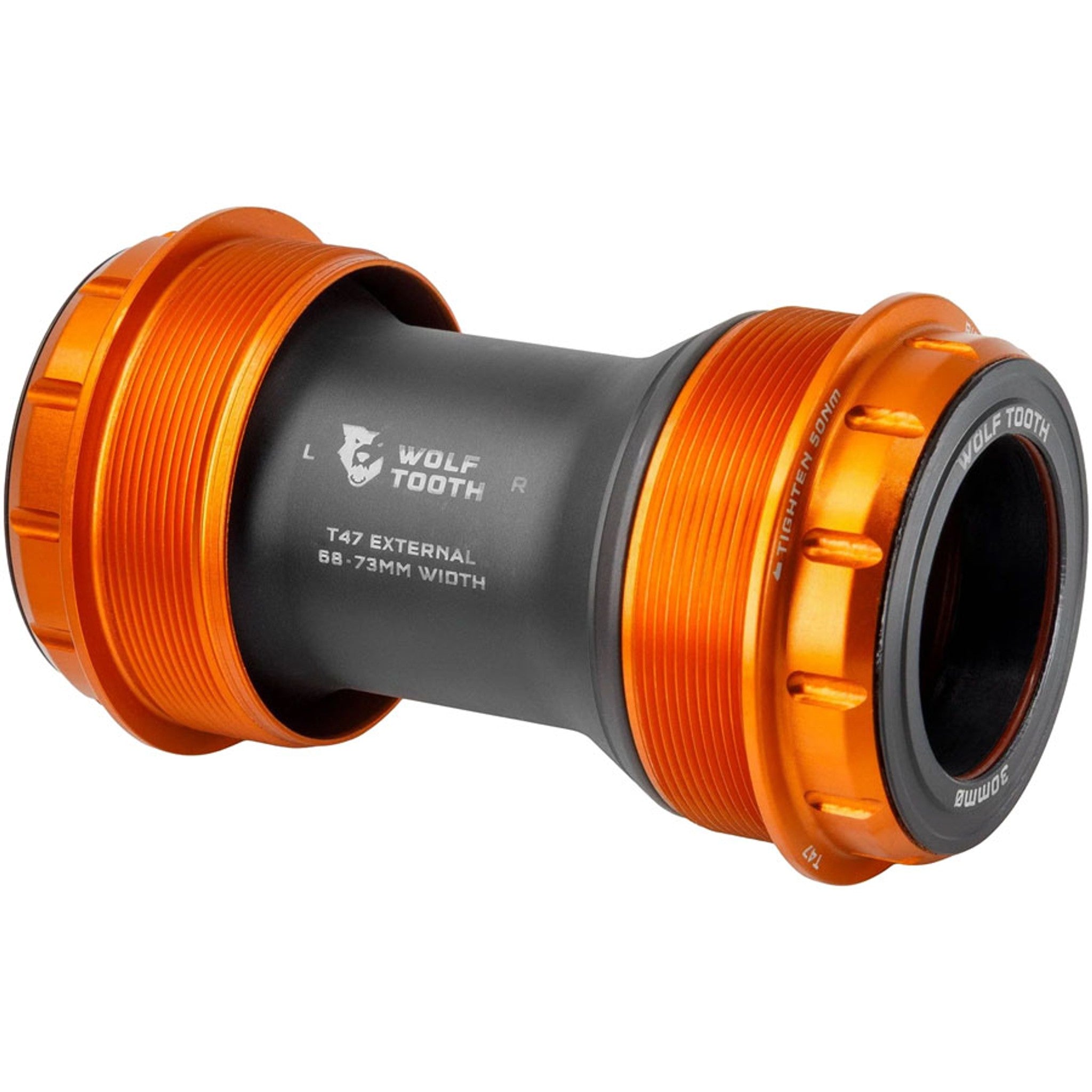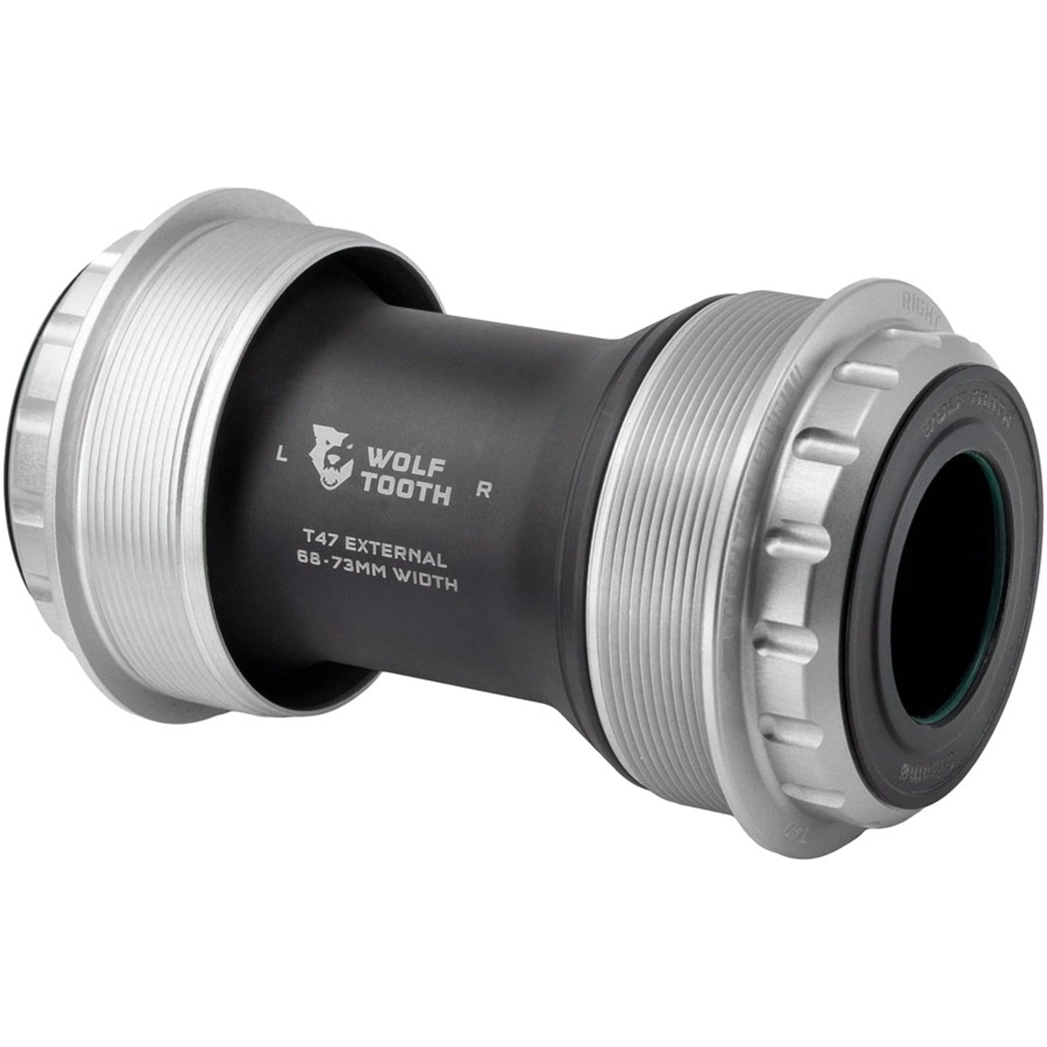 Wolf Tooth T47 External bottom Brackets are engineered to be smooth, durable, lightweight, fast, and user-serviceable. Their ground-up design features custom bearings, seals, bushings, and cups, which eliminate creaking and balance best-in-class weather sealing with optimized bearing radial compression, alignment, and preload for low drag. The Wolf Tooth Bottom Bracket bearings feature custom designed balls and races that are made from a hardened chrome bearing steel which has a higher surface hardness than stainless to improve the durability, reduce spinning resistance, and noise. An ACOSUR ZNA coating has also been applied to the race to provide corrosion resistance that is equal to or better than stainless steel after a 500-hour saltwater test. Bearing material paired with an extensive sealing system and the elimination of metal-on-metal contact means Wolf Tooth Bottom Brackets deliver superior performance in all conditions. Wolf Tooth bottom brackets are designed, engineered, machined and assembled in-house at Wolf Tooth HQ in Minnesota, USA.
