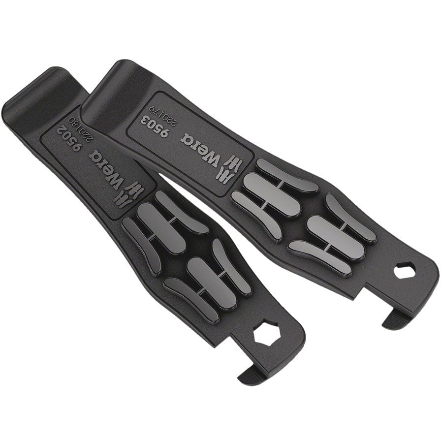 Bicycle Tool Set 13 is a two-piece lever set constructed from glass fiber reinforced plastic, and features 1/4" bit holder, and a Presta valve removal tool.