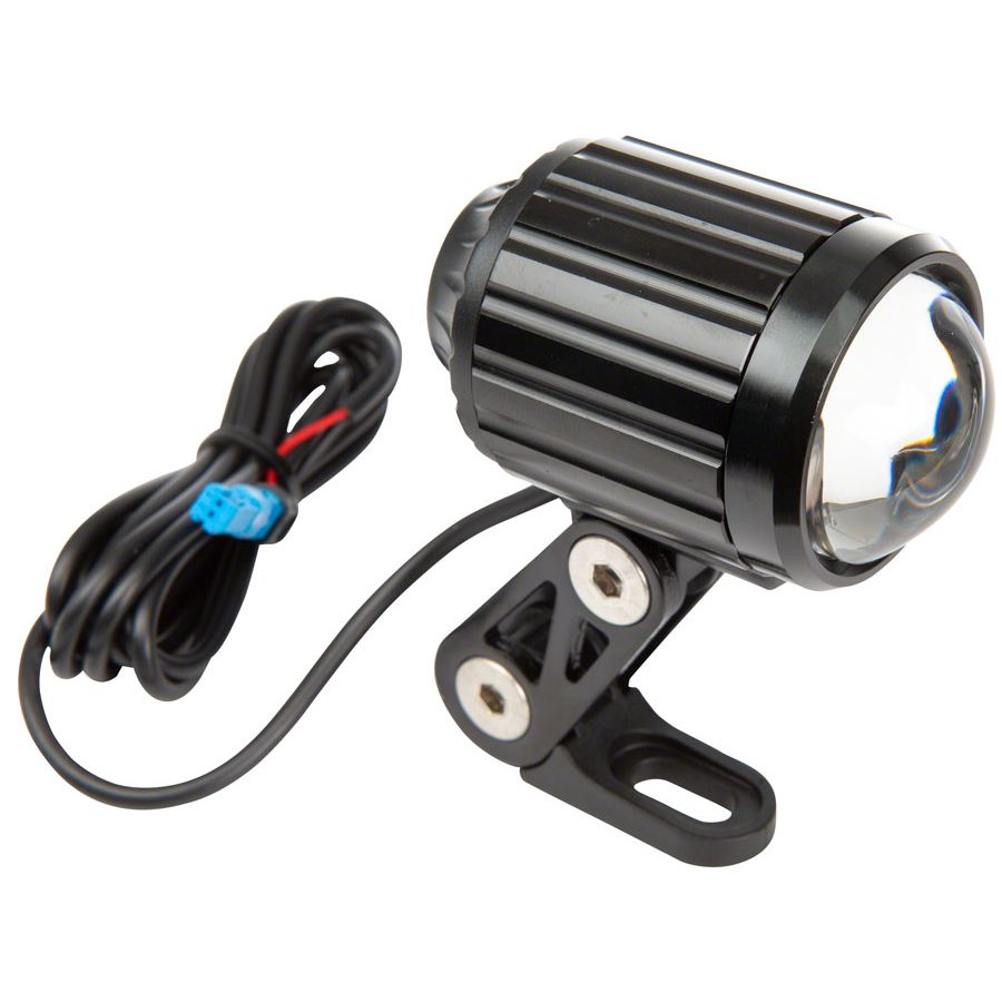 Planet bike Current 500 eBike Light- 500 lumen e-bike headlight with pre-installed connector plugs for easy integration into Bosch system platforms. The head light is also compatible with other e-bike power sources. The light mounts to the fork crown and delivers 500 lumens of light with a path-friendly horizontal cutoff beam for courteous, anti-glare illumination.